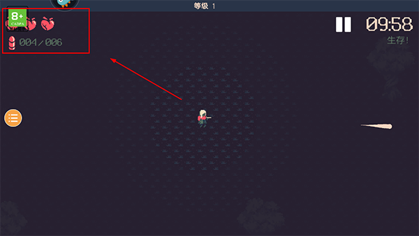 4、游戏界面右上角显示子弹状态(当子弹数为0时,需要根据武器装填等待时间进行填充)和生命值点。