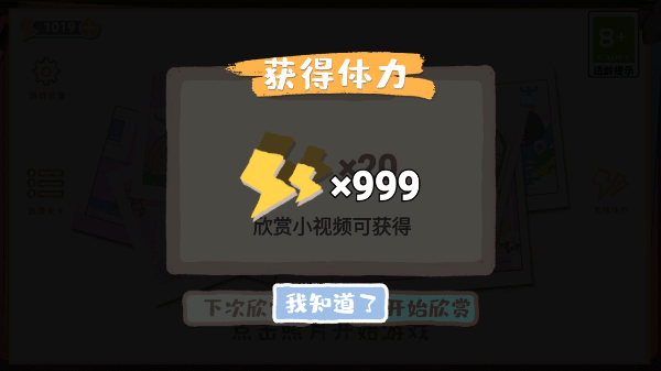 4、如果没有可用的体力,点击左边的体力加号,点击“获取”,就可以免费获得999的体力,这与免费打开关卡是一样的,但它也需要观看第三方广告。
