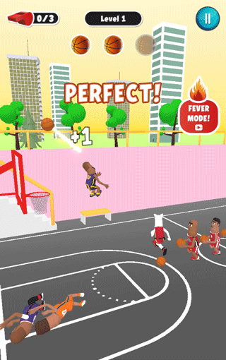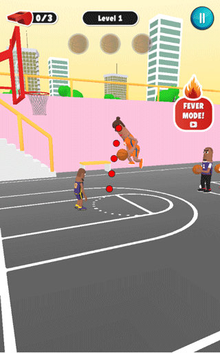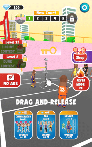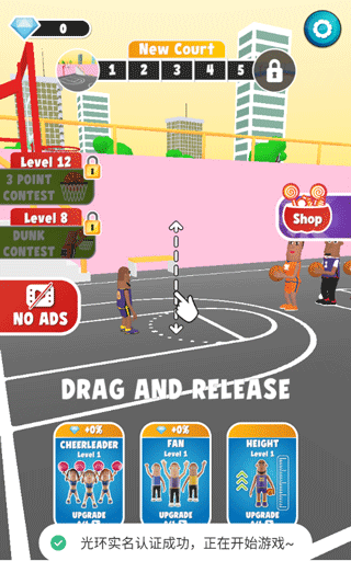 1、拖动角色起跳,瞄准篮筐,将篮球投进篮筐,得到相应的分数。