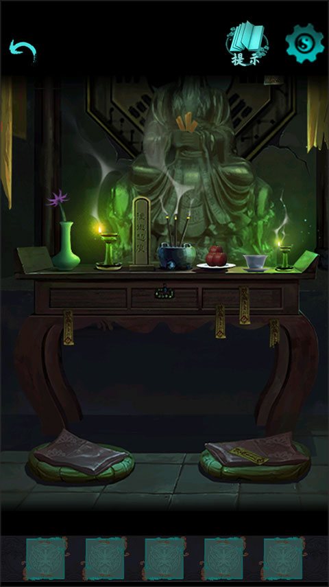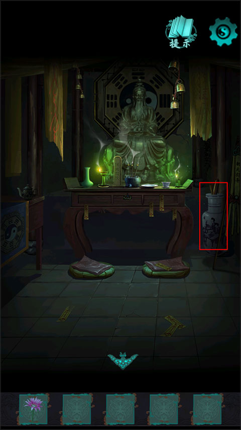 6、在花瓶中查看到相关提示,需要集齐香、花、灯、水、果五种供品,供奉桌上已经有香、灯、水三种,你需要去寻找剩下的两样物品。