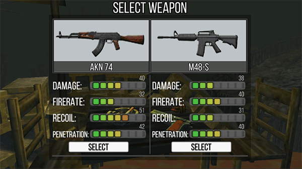 1、打开末日侵袭游戏后,需要选择武器,只有AK和M4两种可选。新手或手残玩家建议选择M4,操作简单;高手可以使用AK,威力更大但操作难度略高。