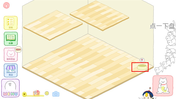 1、刚进入猫咪很可爱可我是幽灵游戏时,会看到一个猫盆,点击它就可以往里面放入猫粮,让猫咪开始进食。