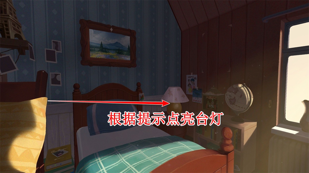 5、正式游玩,完成开头剧情后,角色会从房间中醒来,点击台灯点亮房间,即可进入正式的游戏探索与冒险阶段。