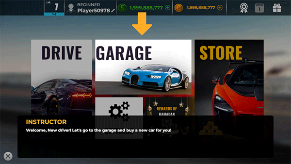 1、下载安装真实停车大师游戏后,进入大厅界面,根据提示点击GARAGE按钮,即可开始你的冒险之旅。