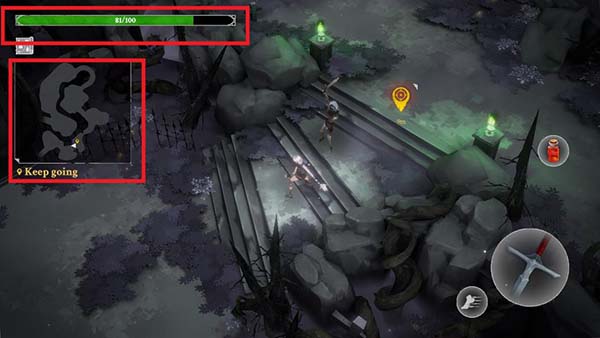 4、屏幕上会显示地形图和角色状态,帮助你规划路线和掌握血量、技能冷却等信息。