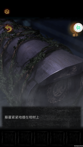3、发现障碍,靠近棺材后会发现,棺材被藤蔓缠绕,暂时无法直接打开,需要寻找工具解决。