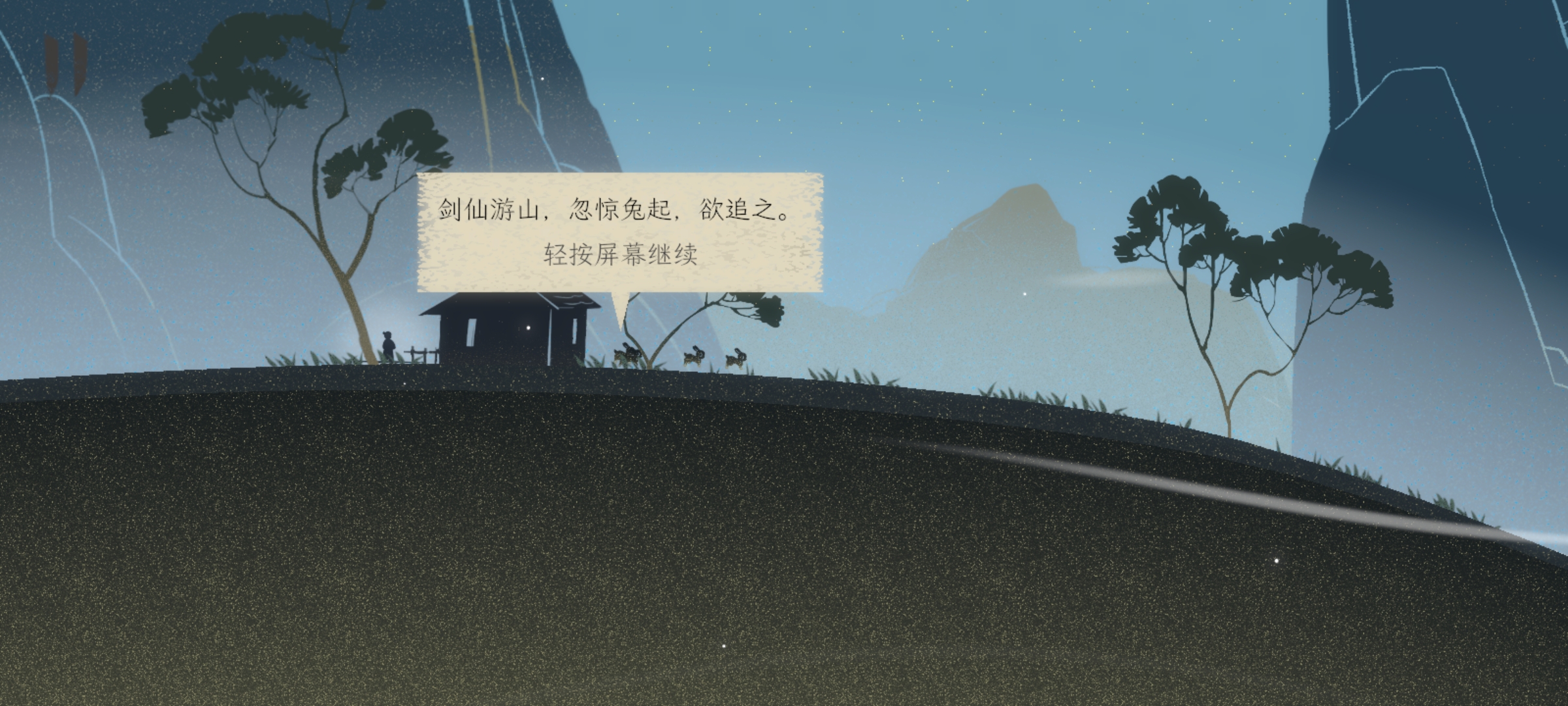 剑仙漫游山间,突然一只兔子惊起,欲追赶它,轻轻点击屏幕,剑仙将继续前进。