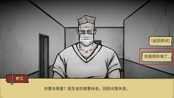 水溢出后,点击房门并与护工对话,告诉她【厕所堵了】。