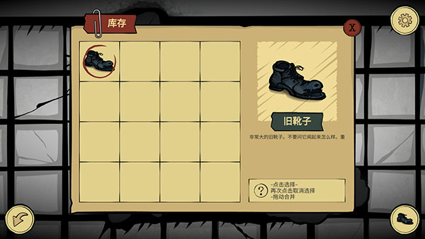 打开背包,选择【旧靴子】。用它将左上角的灰尘清理干净,露出白色砖块。