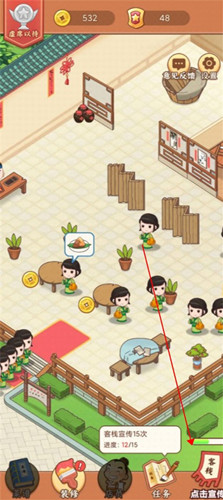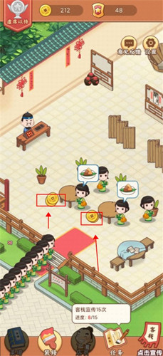 5、客人用餐完毕后,会将消费的金额丢在地上,点击钱袋即可将其收集起来。