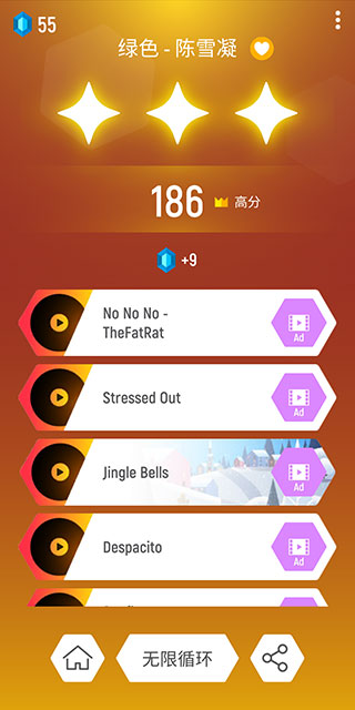 5、当挑战成功后,你会看到自己的得分和获得的奖励。此时,你可以选择让这首歌无限循环播放,或者更换其他歌曲,继续挑战。
