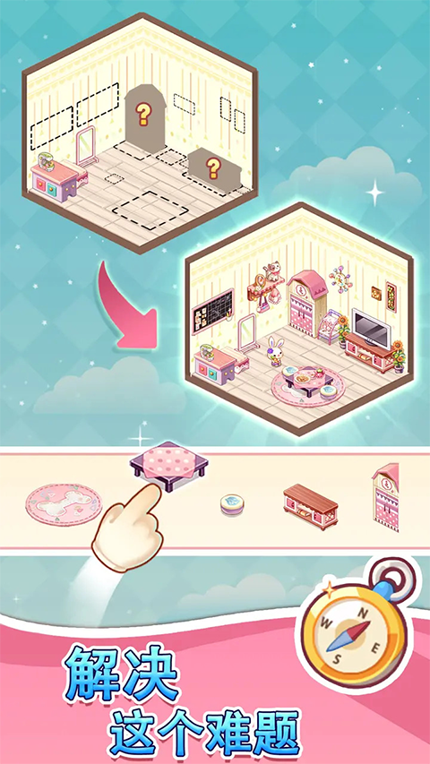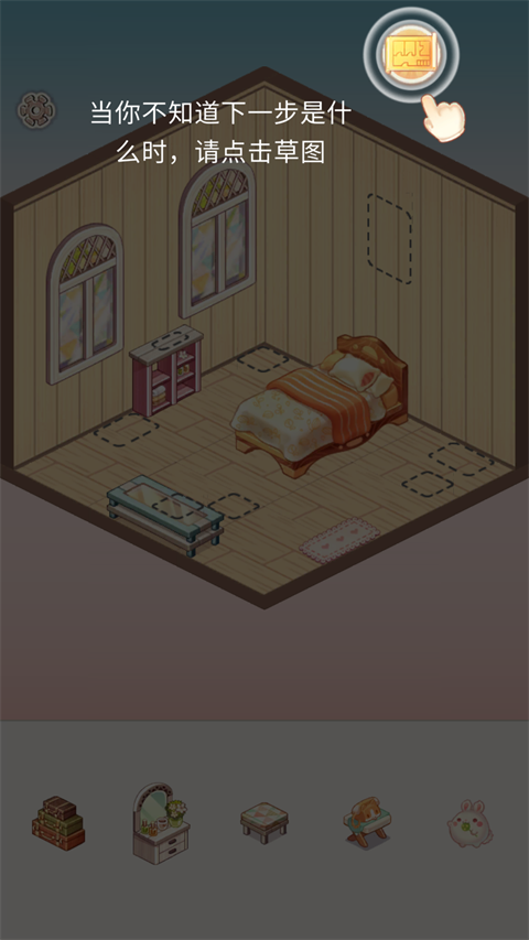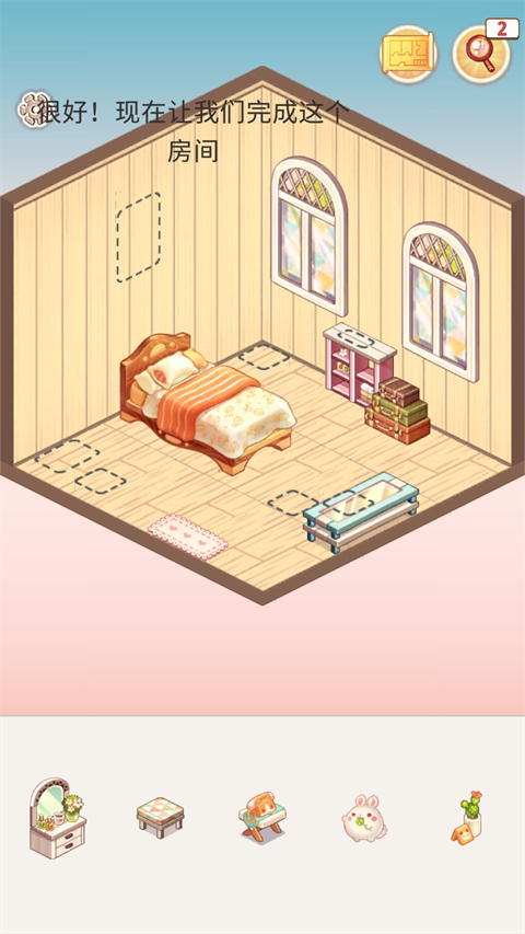 1、通过手指的拖拽,将家具、装饰品等房间部件组装到正确的位置,完成整个房间的布置任务。