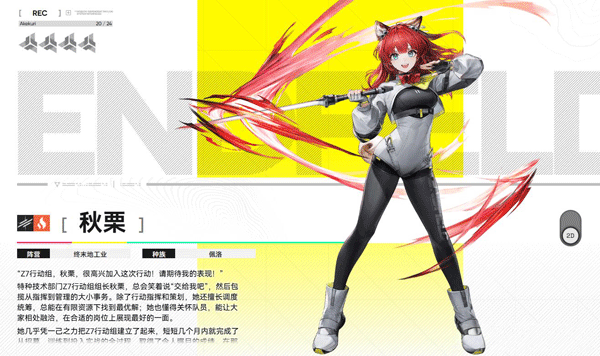 终末地组织的特勤成员,从小随母亲学习武艺,战斗素养非常过硬,性格开朗阳光。定位为副C,使用近战刀进行作战,无需长时间驻留战场即可对周围敌人造成高额伤害,适合多种阵容搭配。