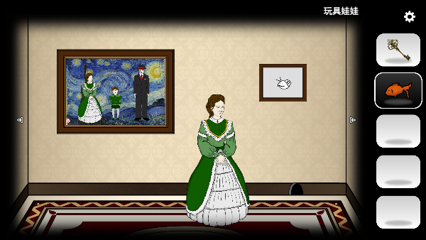 2、点击右边的箭头切换到房间的另一个视角,注意家庭相框左下角的纸条,把它拾取。