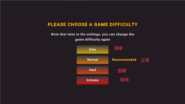 1、进入游戏后,选择英文界面字体,接着在界面中选择自己想要挑战的游玩难度。