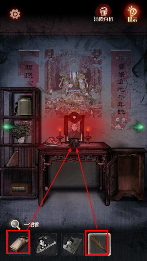 10、向右来到灵位场景,将【一把香】插入香炉中,并用【火柴】点燃,借助烟雾看到显示的数字:583。