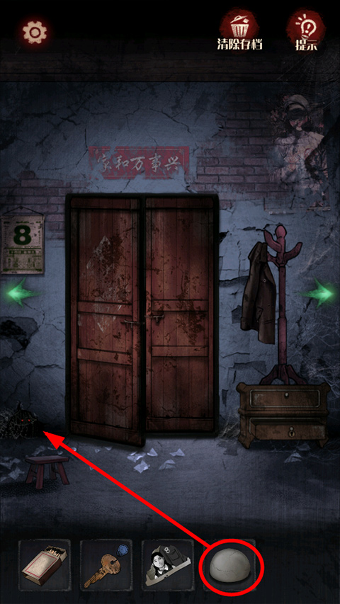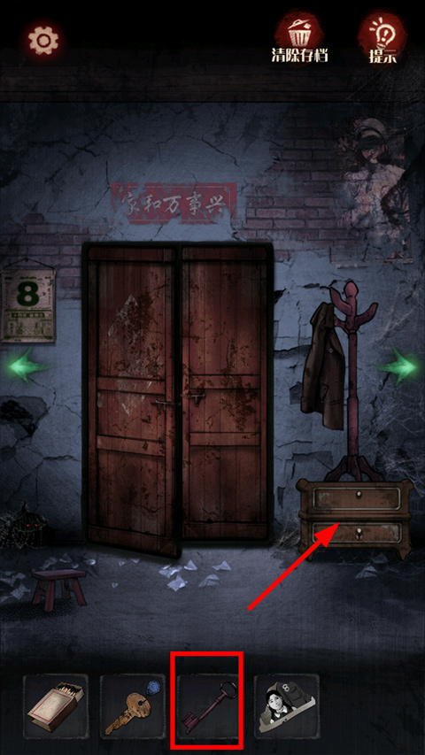 7、向右返回大门口,点击衣架下方的抽屉,用【暗红钥匙】打开抽屉,得到里面的【馒头】。