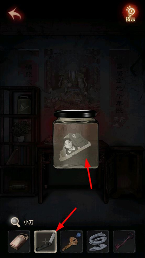 5、点击左边货架最上方的玻璃罐,使用【小刀】将其打开,从中得到【碎照片3】。