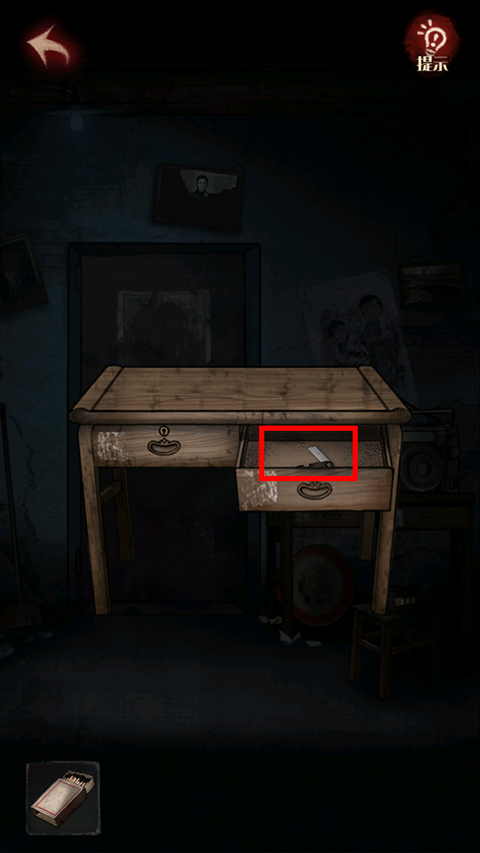 2、向右移动到铁门位置,在桌子右侧的抽屉里找到并获得【小刀】。