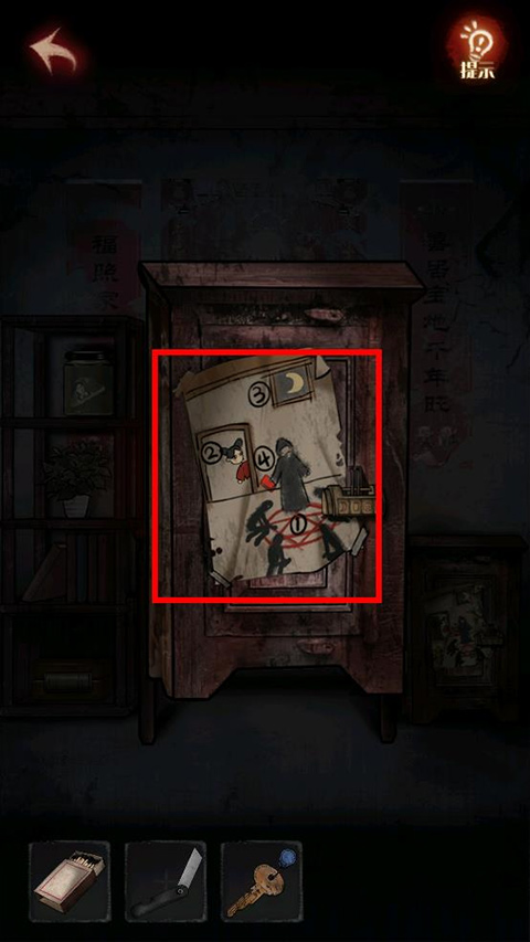 4、检查纸人下方的柜子,记住柜子上的图案顺序:1阵图,2小女孩,3月亮,4书,根据这些提示打开柜子锁,获得【旧衣服】和【暗红钥匙】。