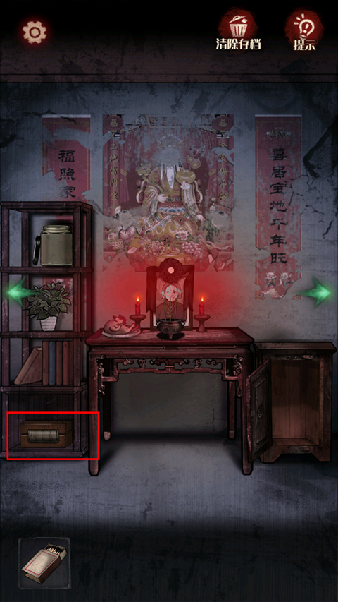 13、再次向右来到灵位场景,点击左边货架下方的箱子,输入密码5863打开箱子,得到【卧房钥匙】。