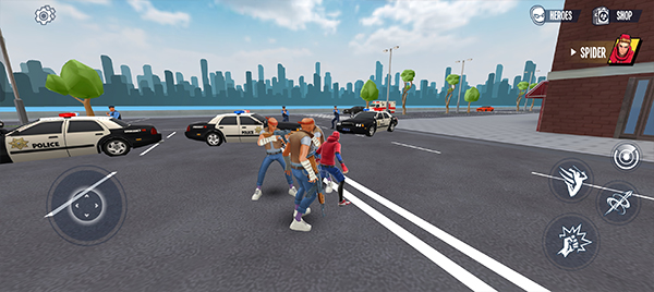 2、游戏玩法非常简单:在有限的生命值内击败所有歹徒。左侧控制角色移动方向,右侧则是各种技能按钮;
