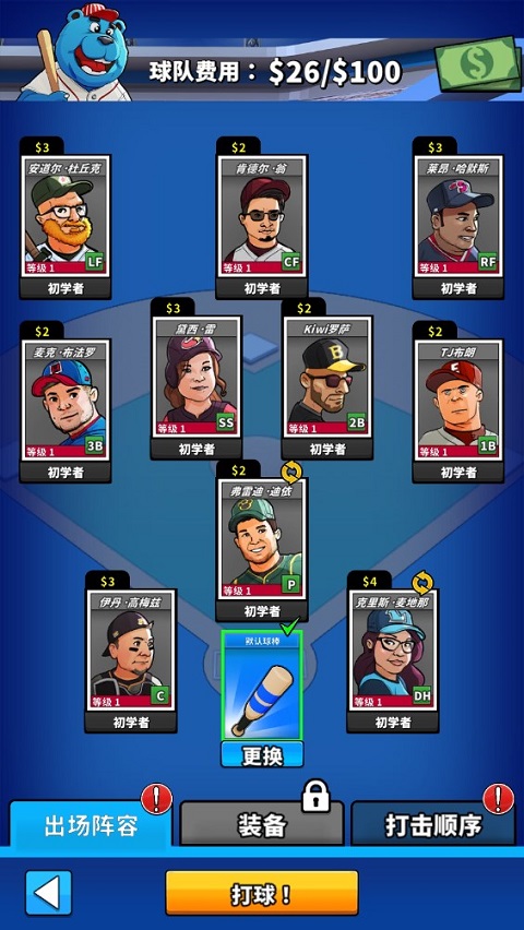 6、每场比赛开始前,你可以在此更换球员阵容,并为他们装备合适的球棒,提升比赛表现。