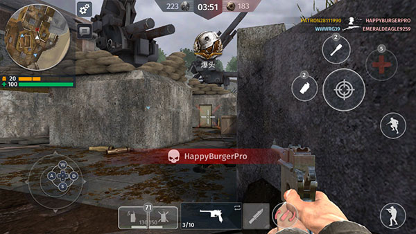 3、进入游戏后,操作很简单:左边控制移动方向,右边控制射击、开镜、换弹等;