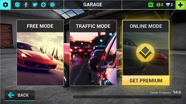2、游戏有三种模式:离线竞速、繁忙街道挑战和实时联网对决,根据喜好选择最适合自己的赛道;