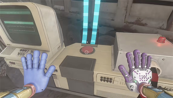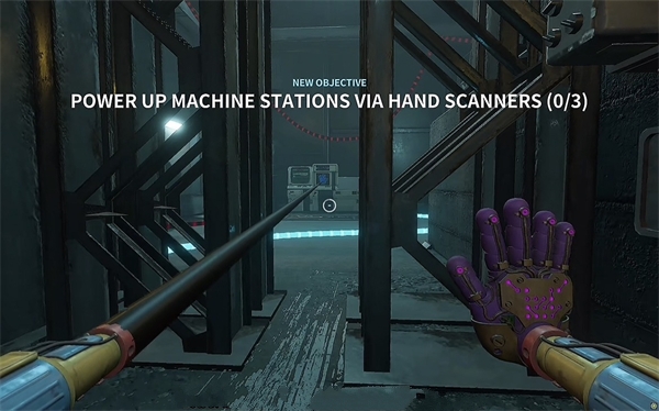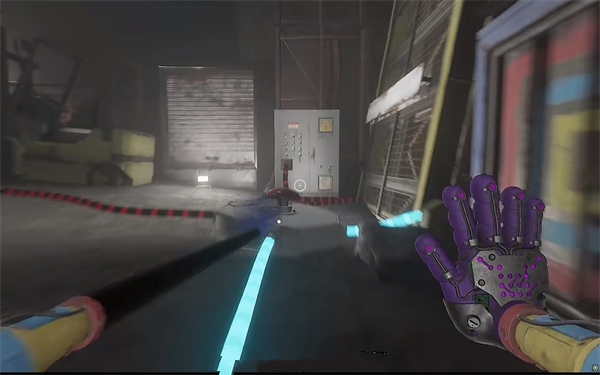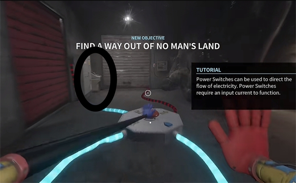 6、进入门内还会有一个开关需要拉下,继续往前走,用蓝色手臂与前方开关互动,这里需要触发三个开关才能使电流打通出口。