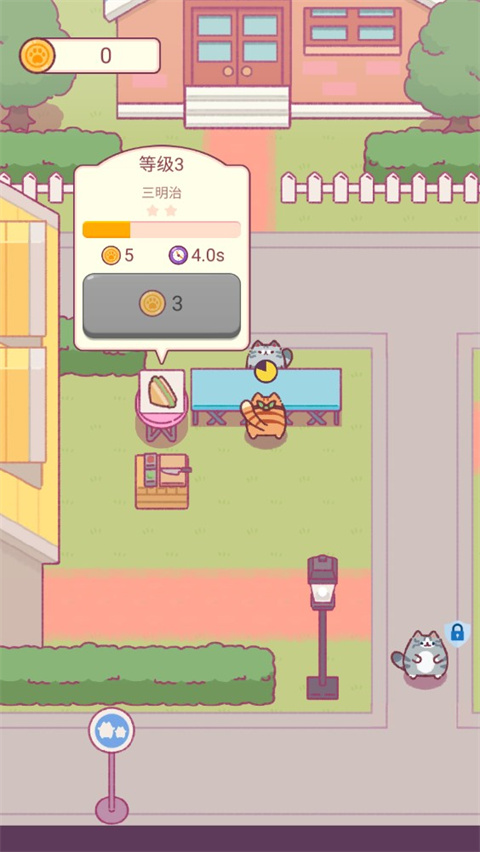 6、点击下方的黄色箭头,可以收获一只猫咪,猫咪能够帮助你加快三明治制作速度。