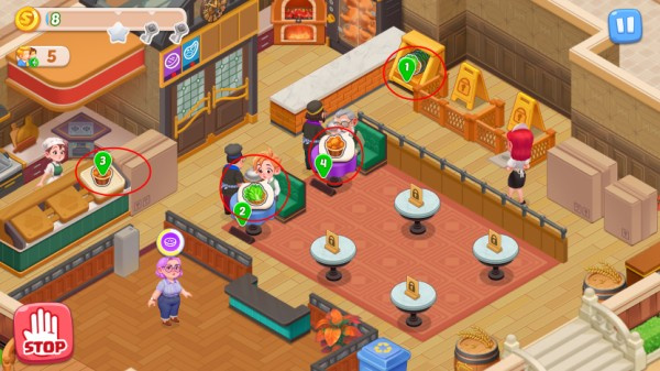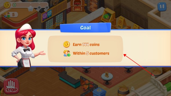 2、以这个关卡为例,你需要服务五位不同的客人,并且在完成任务的过程中赚取至少144金币,才能获得满星评价。