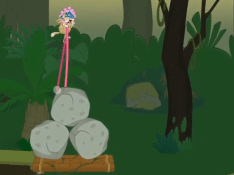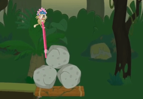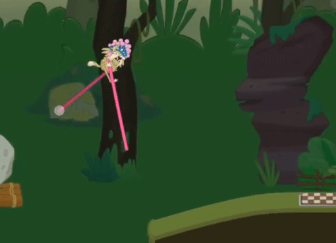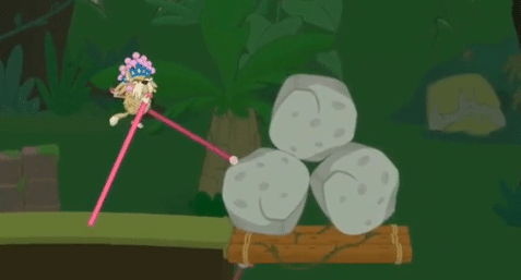 2、每个关卡都有不同的障碍,需要踩着高跷过河,并使用各种道具块成功到达终点。