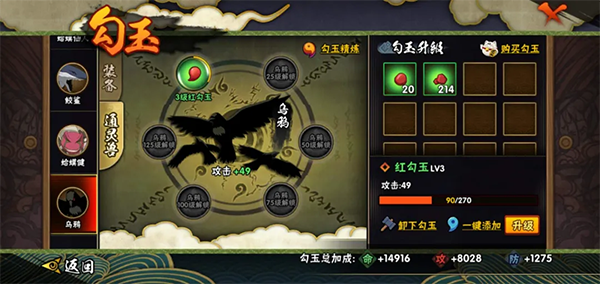 装备和通灵兽都可以镶嵌勾玉,并提升勾玉等级,以增加战力。此外,消耗精炼石和铜币进行勾玉精炼,可以进一步强化对应属性。
