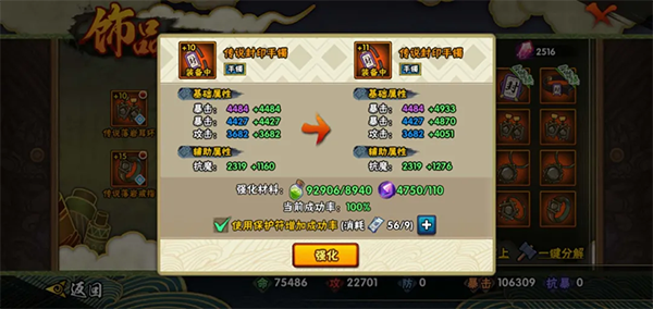 在强化饰品时,除了消耗秘术之尘、秘术之星等固定道具外,还需要使用保护符以提高强化成功率,从而更有效地提升战力。