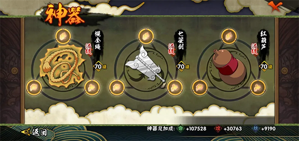 当使用忍玉将神器强化至70级时,另一个神器会解锁。每个神器拥有三个雕文,通过轮回石强化雕文,也能提升战力。忍玉可通过小队突袭获取,轮回石可在各玩法商店兑换。