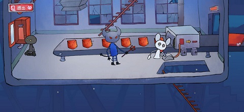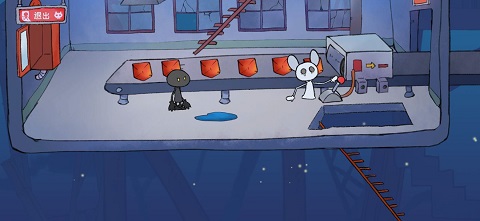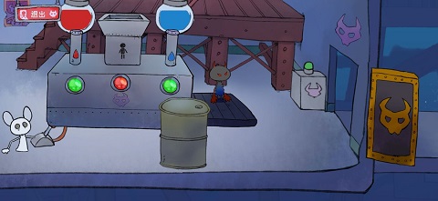 下一关让兔子黑化,这时你可以开始拖拽物品了。把椅子拖过去,拉动环形装置开门。