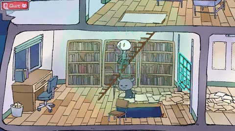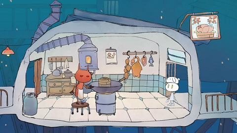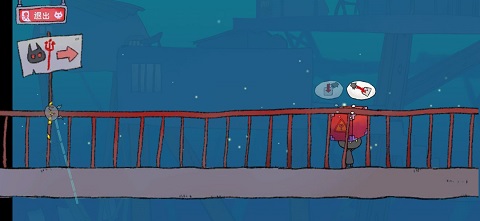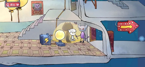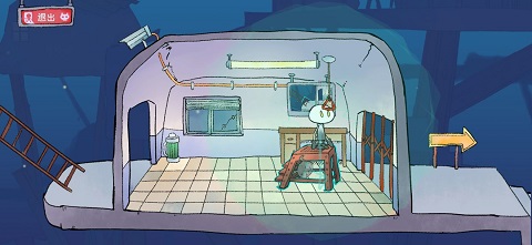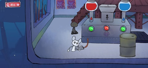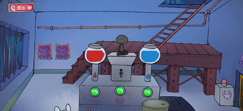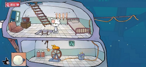 进去后会看到一个在煮饭的人,刚开始你可以进(不过后面好像就进不去了),你需要将一些物品随意拖到锅里几次,搞出一些水蒸气就行了。捡起鸡腿后,向右下方走,拿到气球,这应该是第二个气球。你会注意到这个气球上有绳子,带着气球回到煮饭的房间,向左走。把气球拖到水管那里,气球就会飞起来(是气球装水就能飞吗?)。这时那个胖子会站起来,留下一个灯泡。捡到灯泡后,沿着他坐的地方下去,将绳子拖到破楼梯上,把鸡腿绑到上面,兔子就会开始发电了。然后回到拿气球的地方,把灯泡放下,进行身高测量。