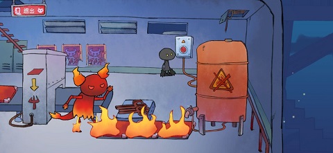 去左边拿灭火器,利用灭火器秒杀右边的火恶魔(灭火器真的能秒杀恶魔吗?)。