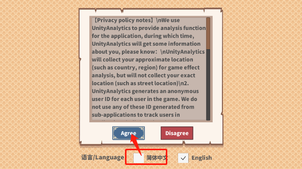 1、进入中华一商游戏后,默认界面为英文,需要在设置中勾选简体中文,然后点击【Agree】确认语言选择。