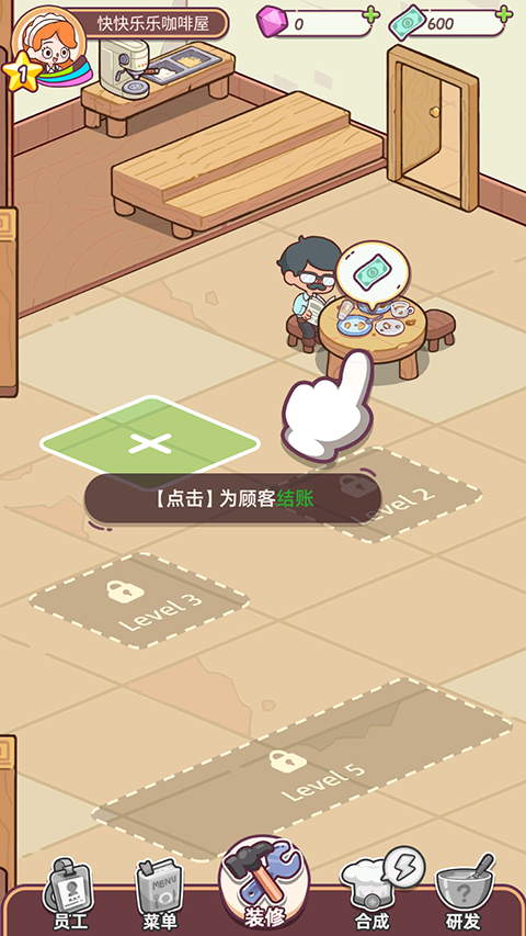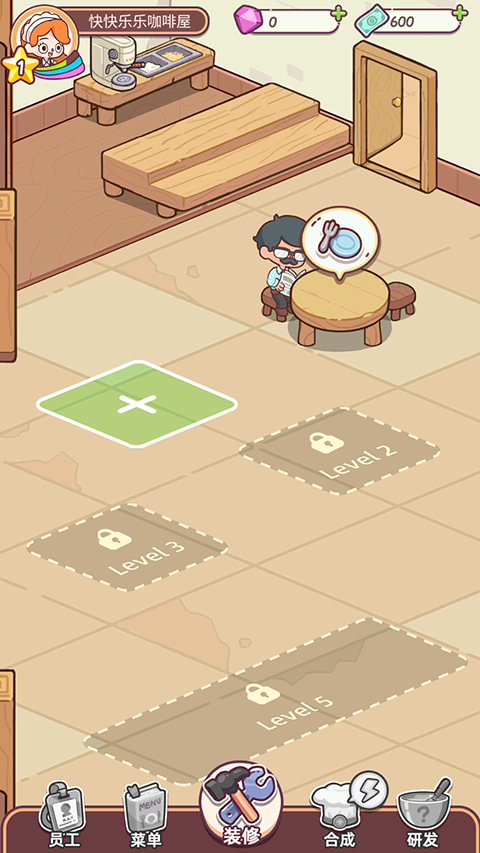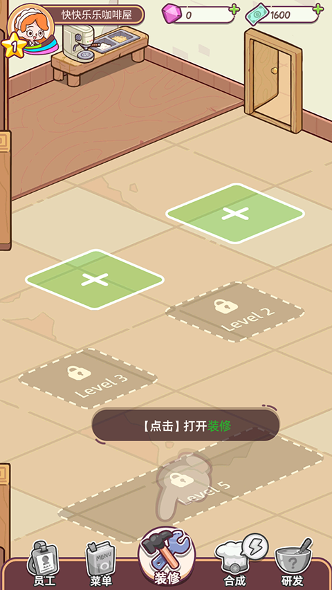 2、点击“装修”选项,可以添加或升级店内设施,让咖啡馆更加完善舒适;