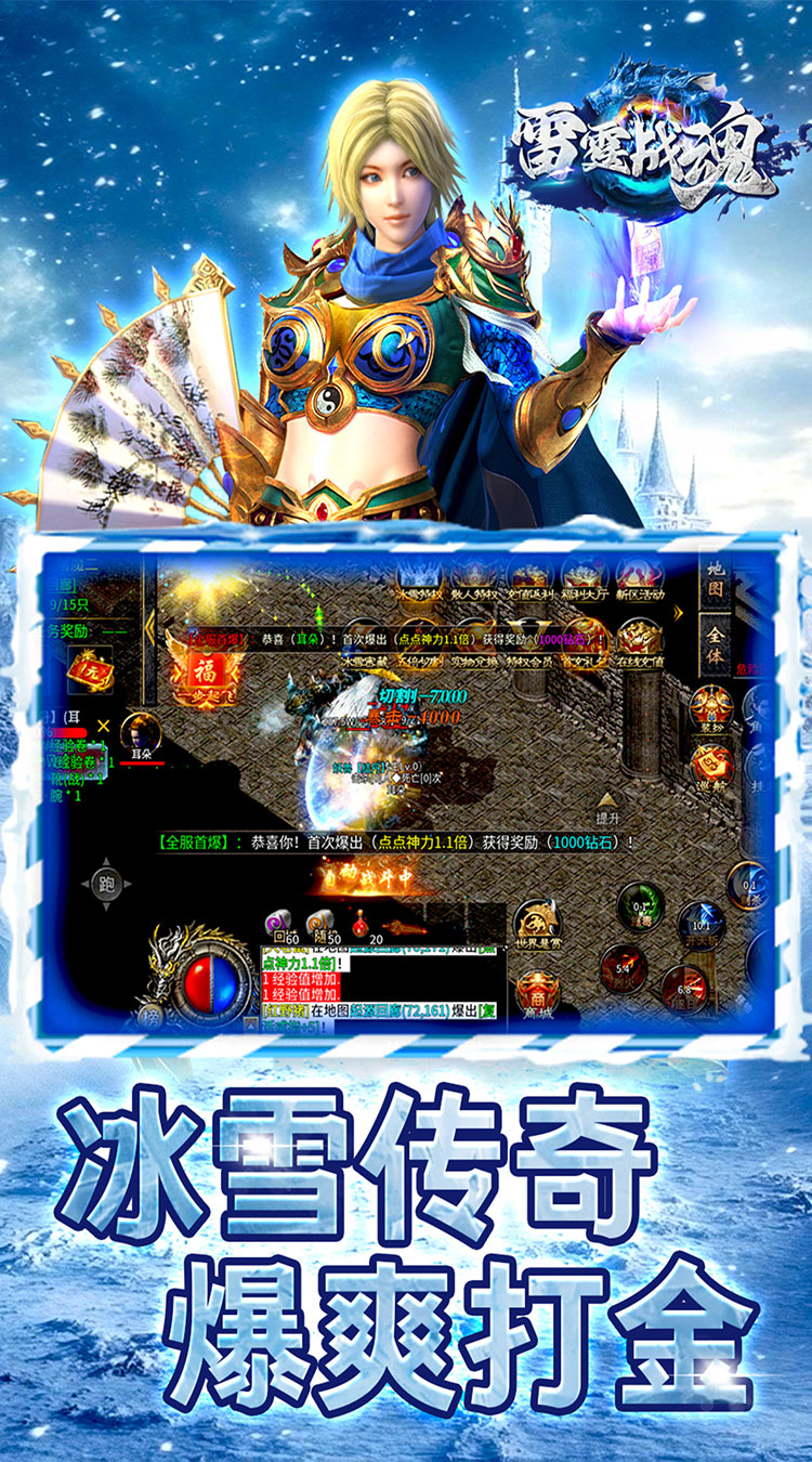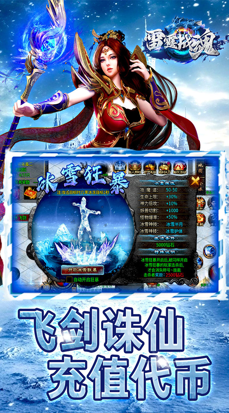 1、雷霆战魂冰雪飞剑诛仙屏幕上充满了炫酷的光环效果,还有巨大的神兽坐骑可以陪伴玩家战斗。