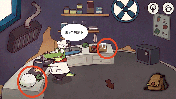 进入左边的蓝色小房子,拾取【大白萝卜】和【小刀】。
