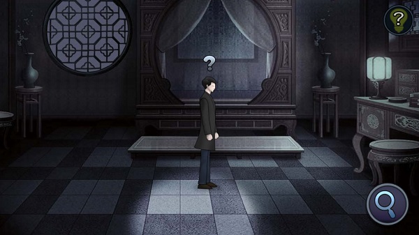 2、当人物头顶出现“?”标志时,可以点击右下角的放大镜与场景或角色进行互动。