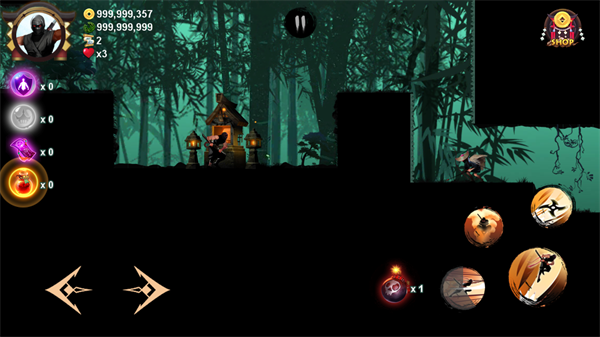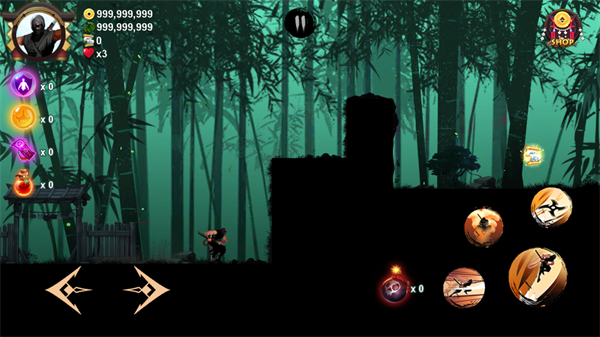 1、操作简单,容易上手,左边是方向控制,右边是跳跃、攻击、冲刺和隐身等按钮。