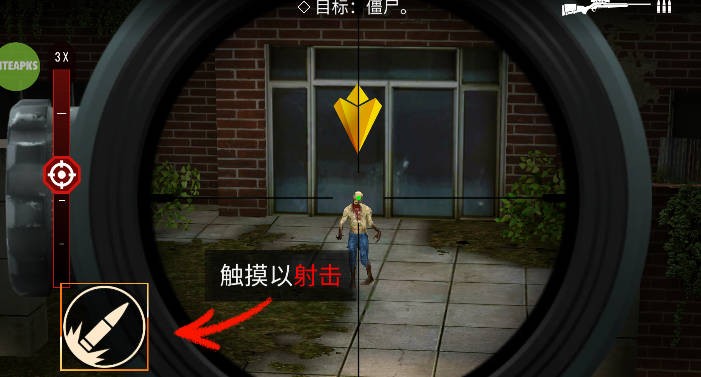 4、僵尸狙击手2最新版通过触摸屏幕控制十字线移动,点击拍摄按钮开始拍摄。
