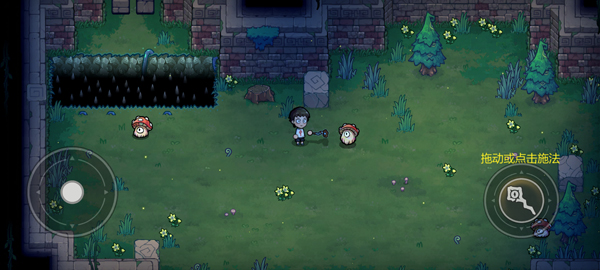 3、角色操作,进入游戏后,可以通过左侧轮盘控制角色移动;点击或拖动法杖按钮来施放魔法攻击。