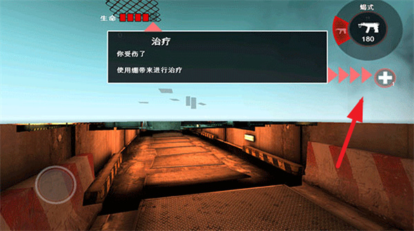 2、当角色受伤时,血量会逐渐降低,因此记得时刻关注自己的血量。你可以点击右上角的“+”按钮,使用绷带来恢复生命。