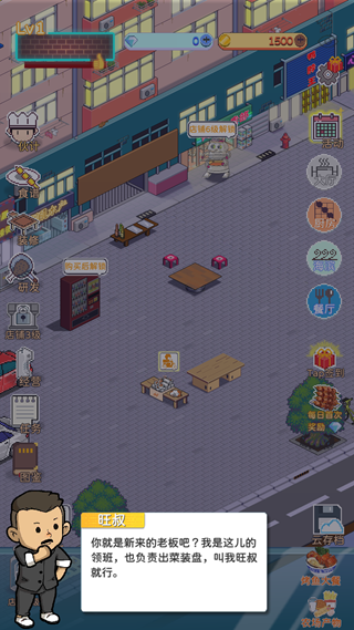 1、点击开始深夜的烧烤店游戏,你将进入到店铺的管理模式,感受一下当老板的乐趣,打造你自己的店铺帝国。