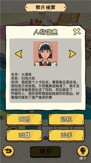 1、这是案件的背景介绍,有一名叫小美的角色遭遇了不幸,玩家的任务是调查整个事件,找出真正的凶手、作案凶器、作案动机以及具体的死因。
